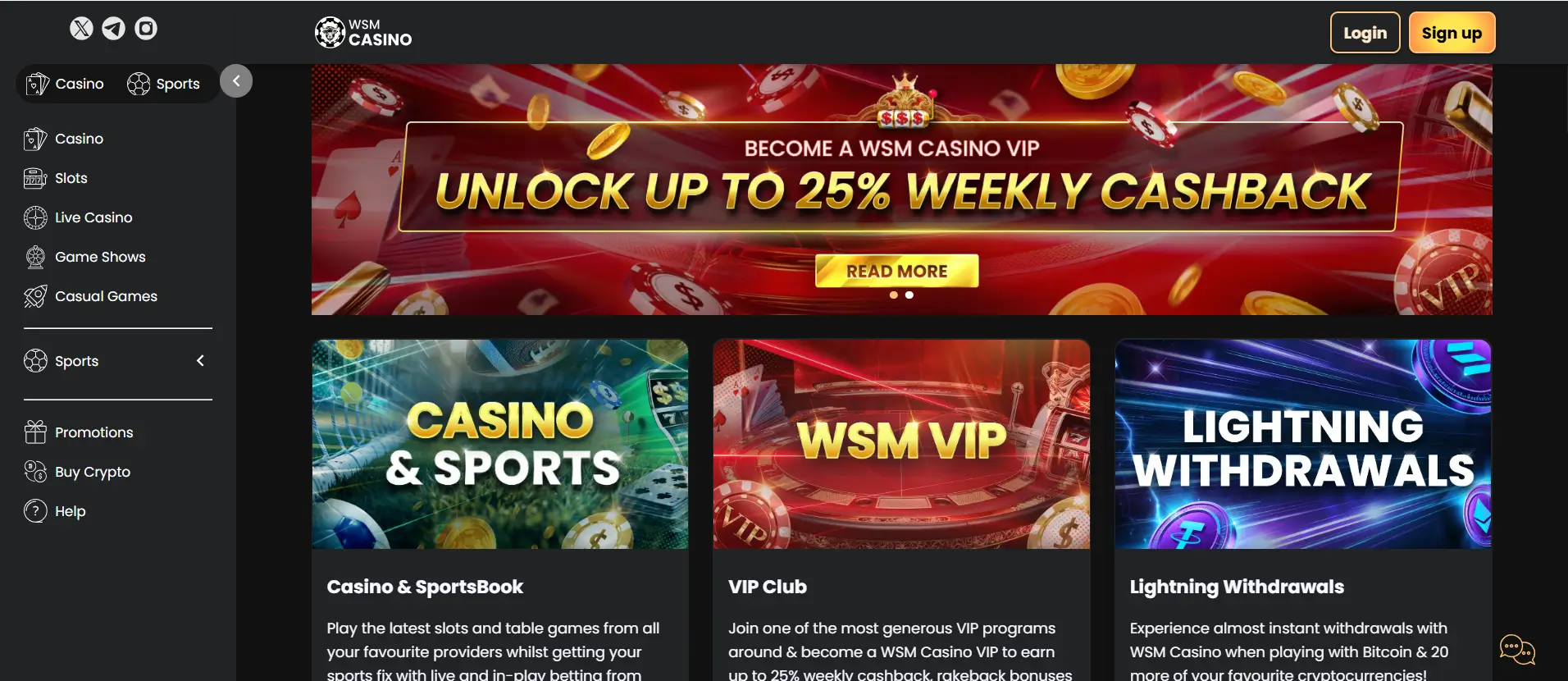 WSM Casino focuses on rapid crypto transactions and supports more than 15 cryptocurrencies. The platform promotes instant or near-instant payouts along with a growing game selection.